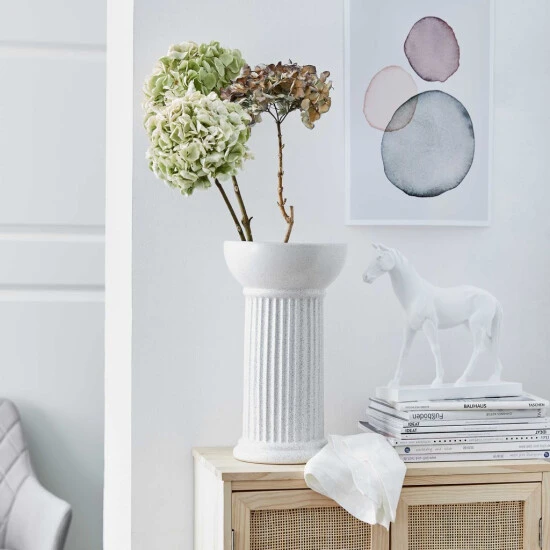 Von der griechischen Antike inspiriert ist die dekorative Amphora Vase aus weißem Steingut. Ihre Form ist an eine dorische Säule angelehnt, mit breitem Säulenkapitell als Vasenöffnung. Üppige Blüten und opulente Sträuße passen zu dieser eleganten Vase, die sich wunderbar mit weißem oder schwarzem Marmor und Gold kombinieren lässt.