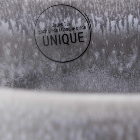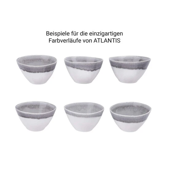Mit unserer Geschirrserie Atlantis im angesagten Boho-Stil und organischen Formen kommt Extravaganz auf den gedeckten Tisch! Durch die reaktive Glasur entstehen unregelmäßige Farbverläufe, die jedes Teil der Serie zu einem echten Unikat werden lassen. Atlantis ist in verschiedenen Farben erhältlich, die Sie miteinander kombinieren können und so für Abwechslung auf Ihrem Tisch sorgen. Durch eine Iris-ähnliche Farbzentrierung passen alle Teile perfekt zusammen. Jedes Teil der Serie ist spülmaschinen- und mikrowellengeeignet.