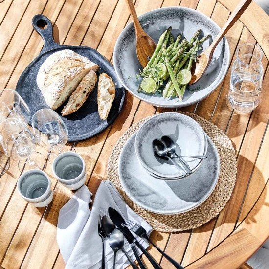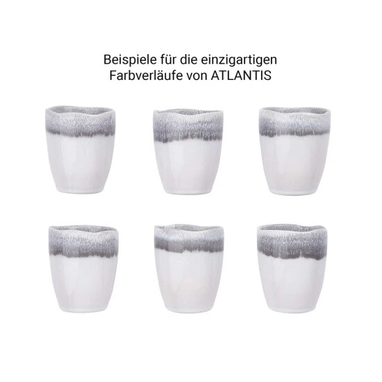 Mit unserer Geschirrserie Atlantis im angesagten Boho-Stil und organischen Formen kommt Extravaganz auf den gedeckten Tisch! Durch die reaktive Glasur entstehen unregelmäßige Farbverläufe, die jedes Teil der Serie zu einem echten Unikat werden lassen. Atlantis ist in verschiedenen Farben erhältlich, die Sie miteinander kombinieren können und so für Abwechslung auf Ihrem Tisch sorgen. Durch eine Iris-ähnliche Farbzentrierung passen alle Teile perfekt zusammen. Jedes Teil der Serie ist spülmaschinen- und mikrowellengeeignet.