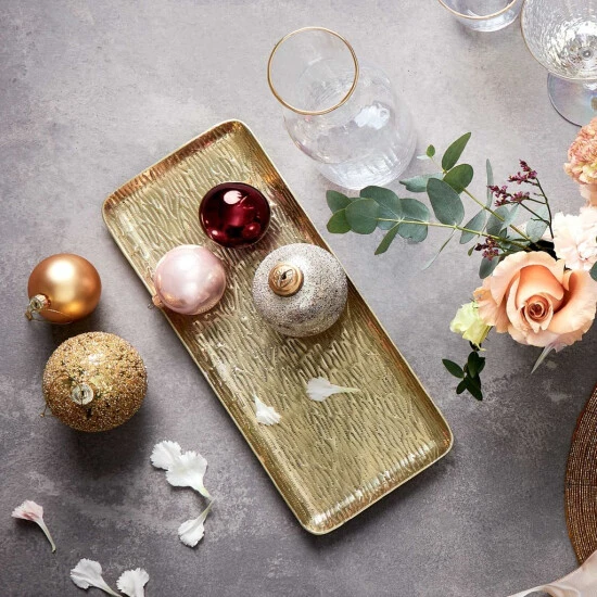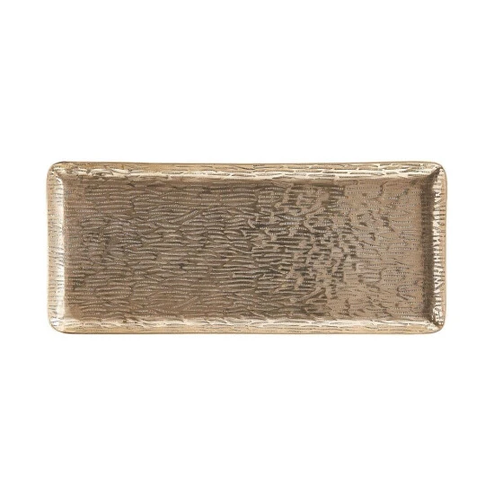 Das Aureo Deko Tablett aus Aluminium ist allen gewidmet, die sich an satten Goldtönen in ihrem Zuhause gar nicht sattsehen können. Seine strukturierte, leicht unebene Oberfläche sorgt für eine individuelle Optik und macht dieses schimmernde Deko-Objekt zum Hingucker. Passende Vase erhältlich, ideal zum Kombinieren.