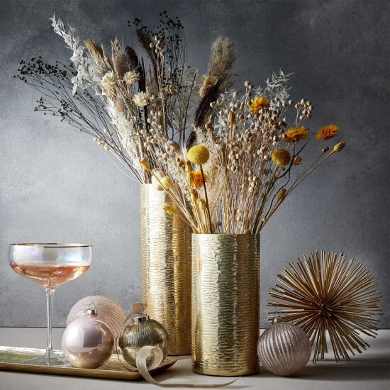 Ein echter Allrounder für jeden Dekozweck und alle möglichen Blumen oder Sträuße ist die Aureo Metall Vase in Gold aus Aluminium. Mit ihrer klassischen Form und universellen Höhe von 20 cm passt diese Vase auf Beistelltische, auf die gedeckte Tafel oder auf Sideboards bzw. Kommoden. Dabei lassen sich auch mehrere dieser goldenen Vasen gruppieren, etwa mit unterschiedlichen Blumen – fertig ist die stilvolle Tischdekoration.