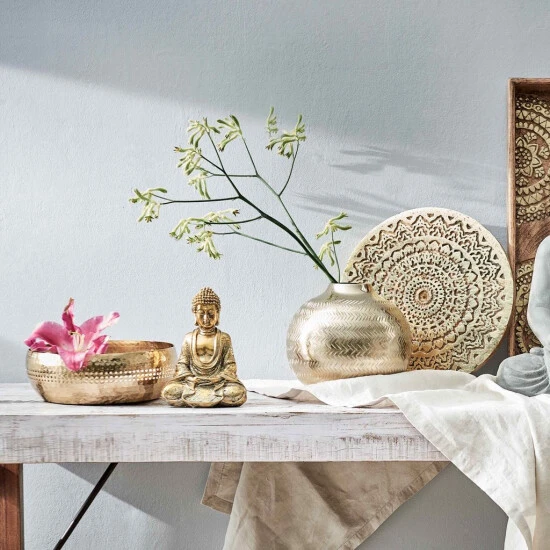 Detailverliebte Handwerkskunst hat eine lange Tradition auf Bali, und daran knüpft die exotische Bali Deko Schale mit Lochrand an. Sie ist aus Aluminium in Gold gefertigt und zusätzlich mit einem aufwändigen Hammerschlag-Muster versehen, das dezente Lichtreflexe entstehen lässt. So wird die Schale zum dekorativen Hingucker auf dem Tisch oder Sideboard, auch in Kombination mit der Bali bauchige Metall Vase in Gold. Nur zu Dekozwecken.