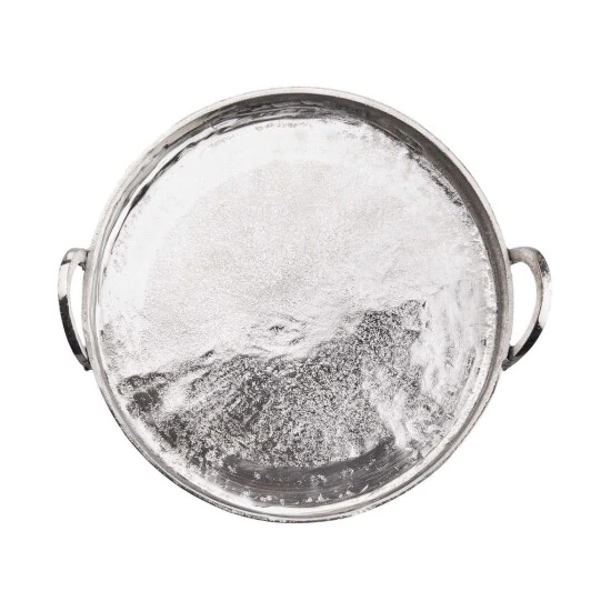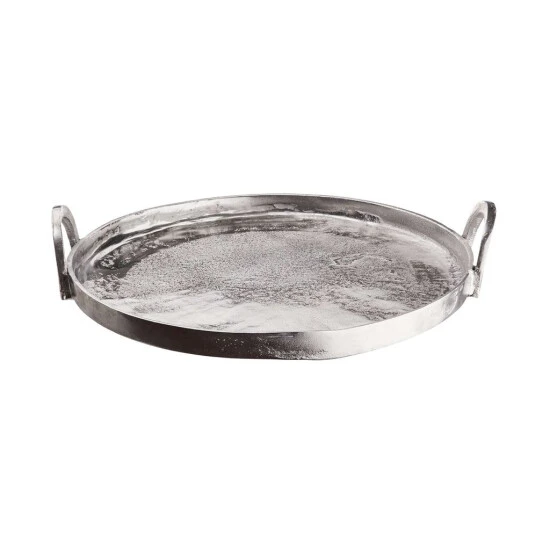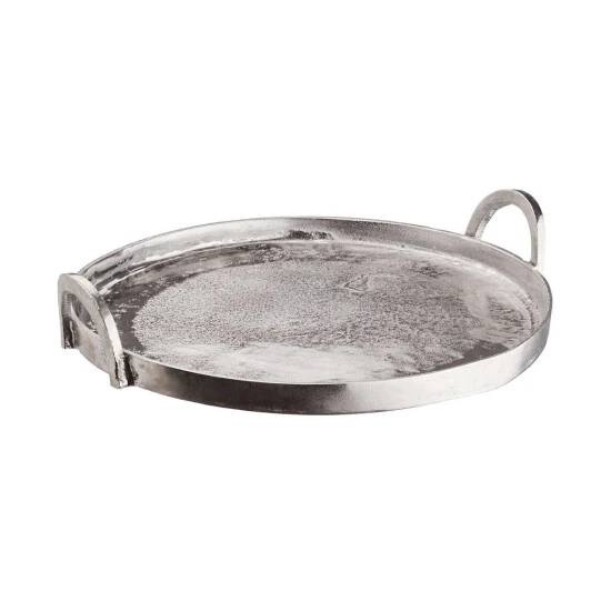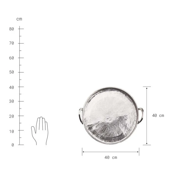 Mit dem runden Banquet Deko Tablett mit Griffen aus Aluminium in Silber schaffen Sie die elegante Grundlage für Ihre individuelle Deko: Einfach Kerzen, Windlichter, Vasen und andere ausgesuchte Objekte auf dem Tablett anordnen und dann auf einem Beistelltisch oder auf dem Esstisch platzieren. Auf der festlich gedeckten Tafel macht sich das Dekotablett mit 40 cm Durchmesser auch gut als Untersetzer für Flaschen und Karaffen. Mit Filzpunkten an der Unterseite zum Schutz empfindlicher Möbel.