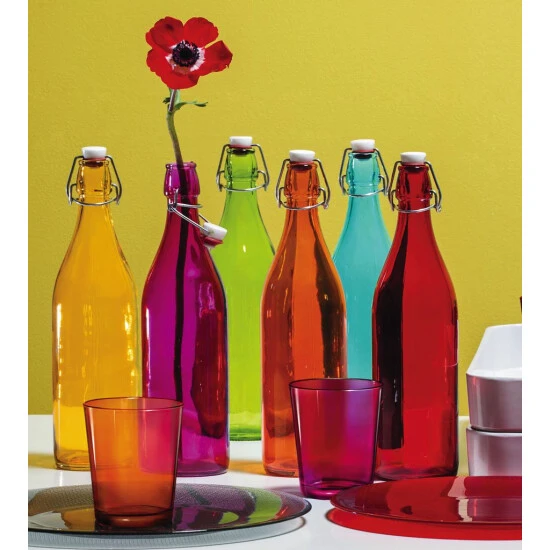 Diese Bormioli Bügelflasche aus der Giara Serie hat eine Kapazität von 1 Liter. Die pinke Bügelflasche macht Ihre Arbeitsplatte durch die Farbe viel lebendiger. Die Bügelflasche können Sie vielseitig verwenden. Ob als Dekoration, Vase oder zum Befüllen mit Lebensmitteln wie Getränke, Salatdressing oder Likör – die Flasche lässt sich nach Verwendung einfach in der Spülmaschine reinigen.