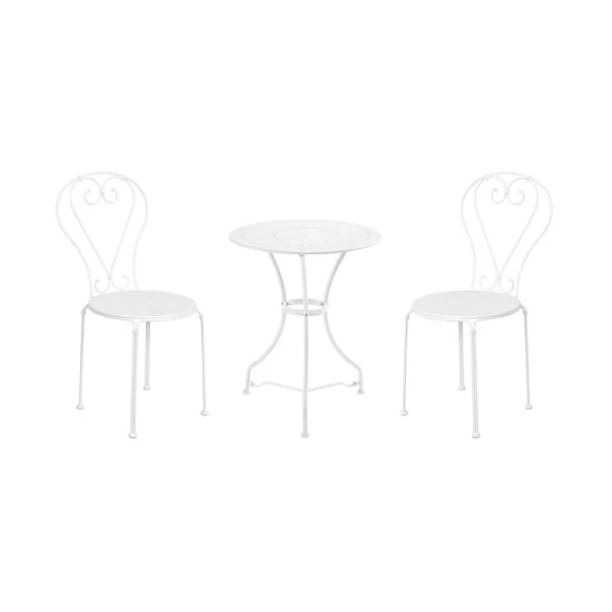 Sie genießen jeden Sonnentag mit Ihrem romantischen Century-Balkonset. So ruhig und entspannt wie in den Jahrhunderten vor Handystress und Alltagshektik. Das Set bestehend aus Tisch und zwei Stühlen im französischen Gartenstil weist die typischen verspielten Schnörkel und das charakteristische Lochmuster auf. Tisch und Stühle mit lackierter Oberfläche und Gummistutzen an den Füßen. Weitere Gartenmöbel-Sets – auch in anderen modernen Farben – erhältlich.