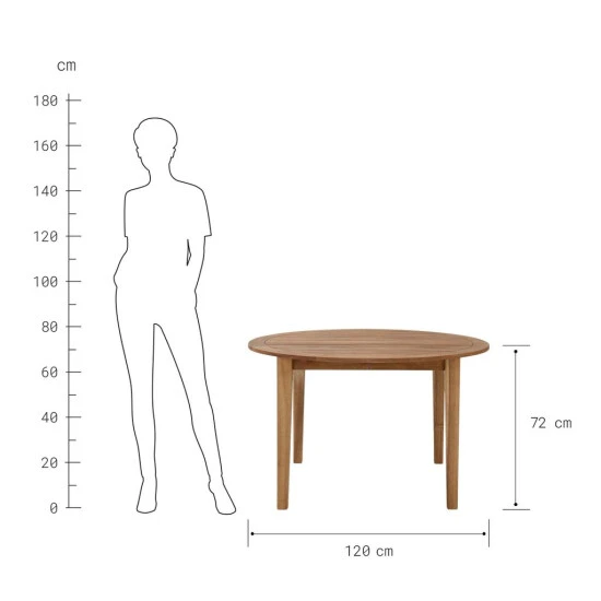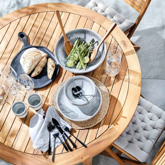 Ein Thema könnte dabei das moderne Design dieses Esstischs sein. Oder sein großzügiger Durchmesser von 120 cm, der genug Platz für ein ausladendes Essen bietet. Oder Sie diskutieren darüber, ob Sie diesen Holztisch lieber auf Balkon oder Terrasse oder in Küche oder Esszimmer aufstellen.