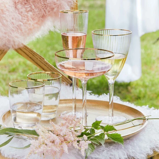 Wasserglas mit Goldrand zuprosten: Ganz angesagt feiern Sie die glamourösen