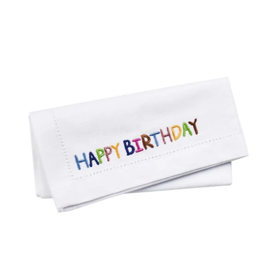 Wer Geburtstag hat, darf sich verwöhnen lassen – mit Glückwünschen, Aufmerksamkeiten und einer fröhlichen Dekoration. Diese leichte Serviette aus reiner Baumwolle ist bunt mit den Wörtern „Happy Birthday“ bestickt. Damit passt sie perfekt zu dem Happy Birthday-Tischläufer, auf dem dann gerne eine prächtige Geburtstagstorte thronen darf.
