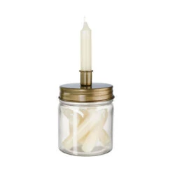Raffiniert: Das Candle Jar Glas mit Kerzenhalter setzt dem Aufbewahrungsglas für Little Light Kerzen noch einen drauf: Auf dem Deckel aus goldfarbenem Weißbleich kann eine der sieben cremefarbenen Little Light Kerzen befestigt werden. Sobald sie abgebrannt ist, ist Nachschub ohne langes Suchen griffbereit. Ganz schön praktisch dieses 2-teilige Set – und dekorativ sowieso.