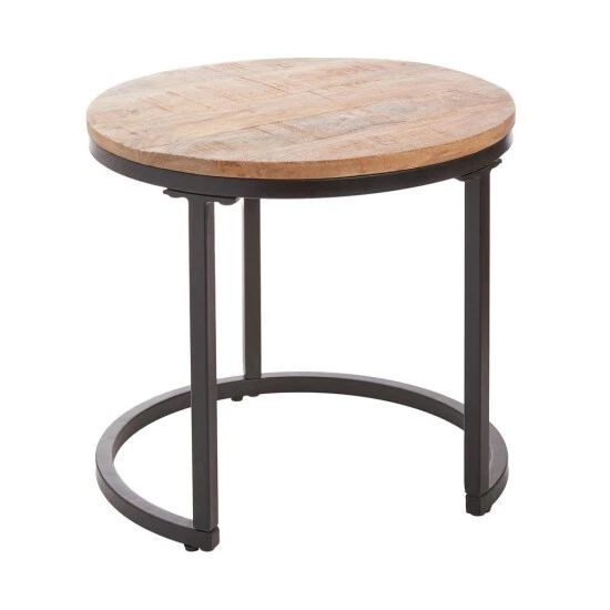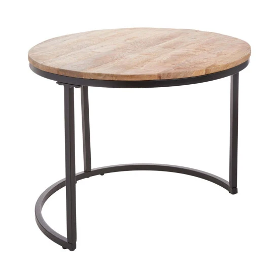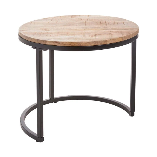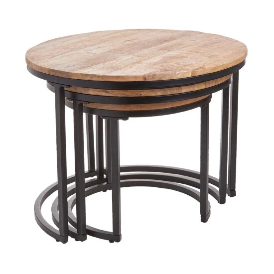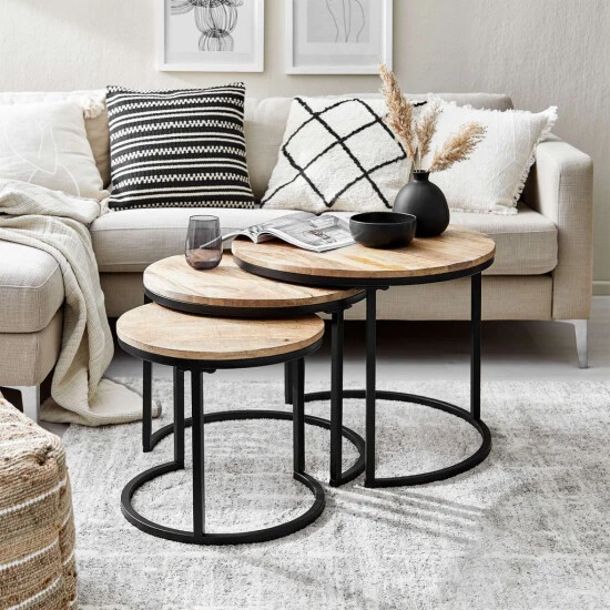 So dekorativ wie praktisch: Mit dem Mangoline Beistelltisch im 3er Set holen Sie sich ein vielseitiges Trio nach Hause. Die drei Tische lassen sich nach Belieben ineinander schieben und auch einzeln verwenden. So sind die Themen Couchtisch, Pflanzhocker, Nachttisch, und Beistelltisch schnell gelöst. Und das moderne Design, das naturfarbenes Holz mit schwarzem Metall verbindet, kann sich dabei in jeder Variante sehen lassen.