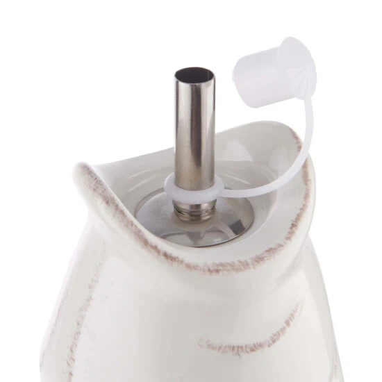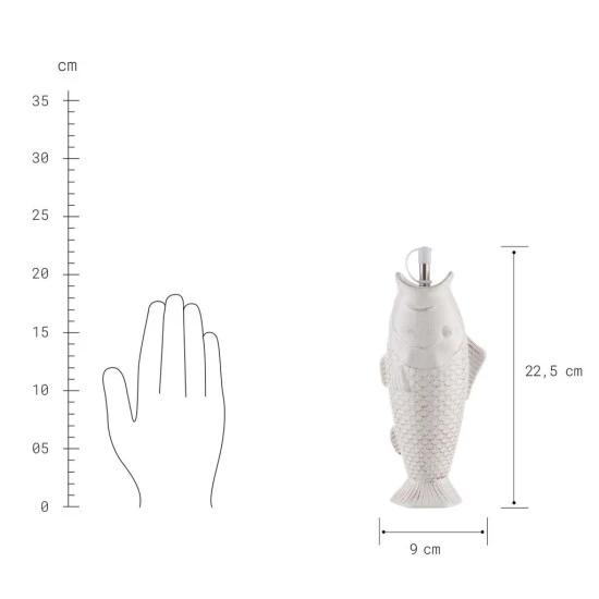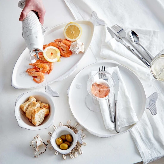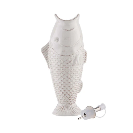 Für Ihren kreativ gedeckten Tisch angeln Sie sich die weiße Pescara Ölflasche 370 ml in Fischform aus Keramik mit Edelstahl-Ausgießer. So können Sie und Ihre Gäste beim Essen nach Belieben ein hochwertiges Pflanzenöl (z.B. kalt gepresstes Ölivenöl) nach Belieben über den Salat träufeln, gebratenes Gemüse oder leckeren Fisch damit verfeinern. Mit Vintage-Effekt. Weiteres Geschirr aus der Pescara Serie erhältlich, ideal auch zum Kombinieren.