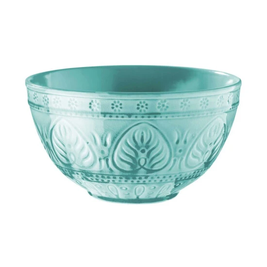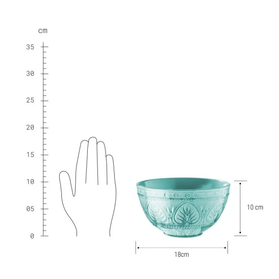 Jedes Teil des 12-teiligen Geschirrsets aus Steinzeug, bestehend aus Speisetellern, kleinen Tellern und Suppenschalen, ist handbemalt, die effektvoll glänzende Glasur in exotischen Farben (innen eher matt) unterstreicht die kostbare Optik. Was für ein sanfter Kontrast zu den sehr scharf gewürzten Speisen, die man in Padang und ganz Sumatra traditionell reicht.
