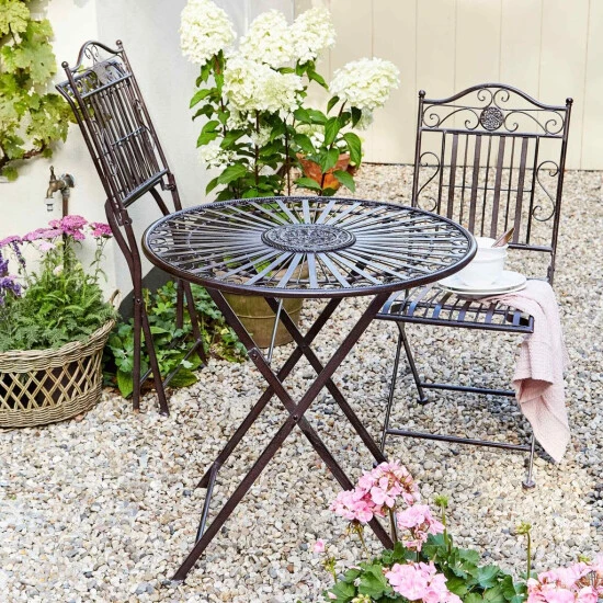 In Ihrem verwunschenen Garten machen Sie es sich mit dem Terrace Hill Set aus einem Klapptisch und zwei Stühlen, alles aus Eisen, gemütlich. Wie alle Teile der aufwendig gearbeiteten Outdoor-Serie ist das Set im romantisch-verspielten Stil gehalten – mit geschwungenen Formen und Teileweise auch mit floralen Ornamenten. Stühle und Bank bieten Ihnen ein besonderes Maß an Sitzkomfort und stellen echte Schmuckstücke dar.