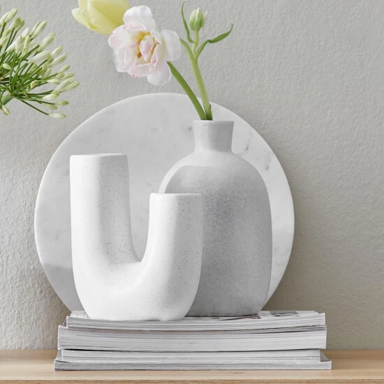 Ihr Design-Zuhause hat eine stylische Vase wie die Tube Keramik Vase aus weißem Dolomit verdient. Diese moderne Vase bietet zwei Öffnungen auf unterschiedlichen Höhen, wobei es besonders lässig wirkt, wenn nur eine der beiden Öffnungen genutzt wird. Mit Trockenblumen, getrockneten Gräsern, grünen Zweigen oder einzelnen Blumen schaffen Sie so einen angesagten Hingucker, z.B. für den gedeckten Tisch.
