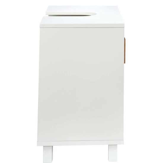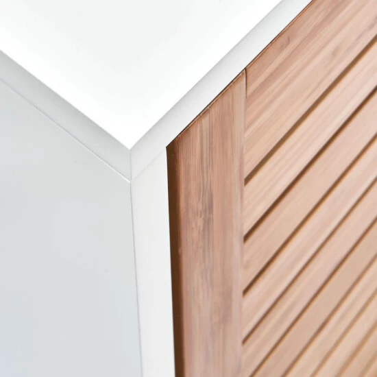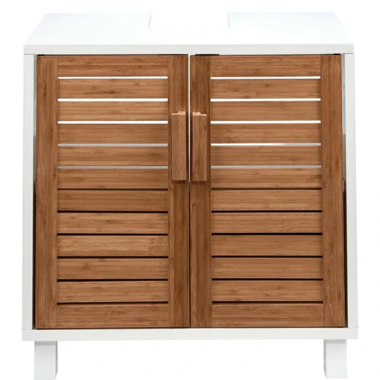 Helle Farben und klare Linien mit praktischer Aufbewahrung in moderner Optik – dieser ordnungsliebende Waschbeckenunterschrank versteht sich direkt mit Ihren Wohnideen und den Anforderungen in Ihrem Badezimmer. Durch die zeitlose Farbkombination aus natur und weiß wirkt er zudem elegant und bietet auf zwei Ebenen optimalen Platz für Ihre Badutensilien. Für ein einfaches Öffnen und Schließen sorgt der Magnetverschluss an den Türen. Durch die Verarbeitung von Bambus, einem schnell nachwachsenden und extrem widerstandsfähigen Rohstoff, punkten Sie zudem in Sachen Nachhaltigkeit. Dies kommt nicht nur der Umwelt zugute, sondern zeigt sich auch in der Langlebigkeit unserer Möbel. Weitere Produkte der Serie erhältlich.